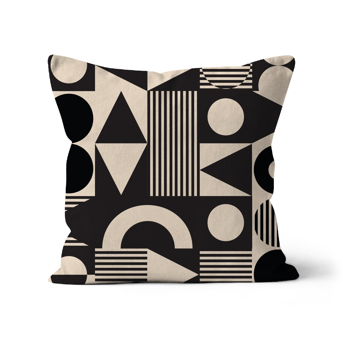 This Bauhaus-inspired geometric cushion covers been designed in our Brighton studio and sustainably made in the UK from 100% organic cotton, it features a bold interplay of shapes — circles, triangles, and stripes — in black and beige. Printed on both sides with a concealed zip closure, this piece adds sculptural sophistication to any interior.