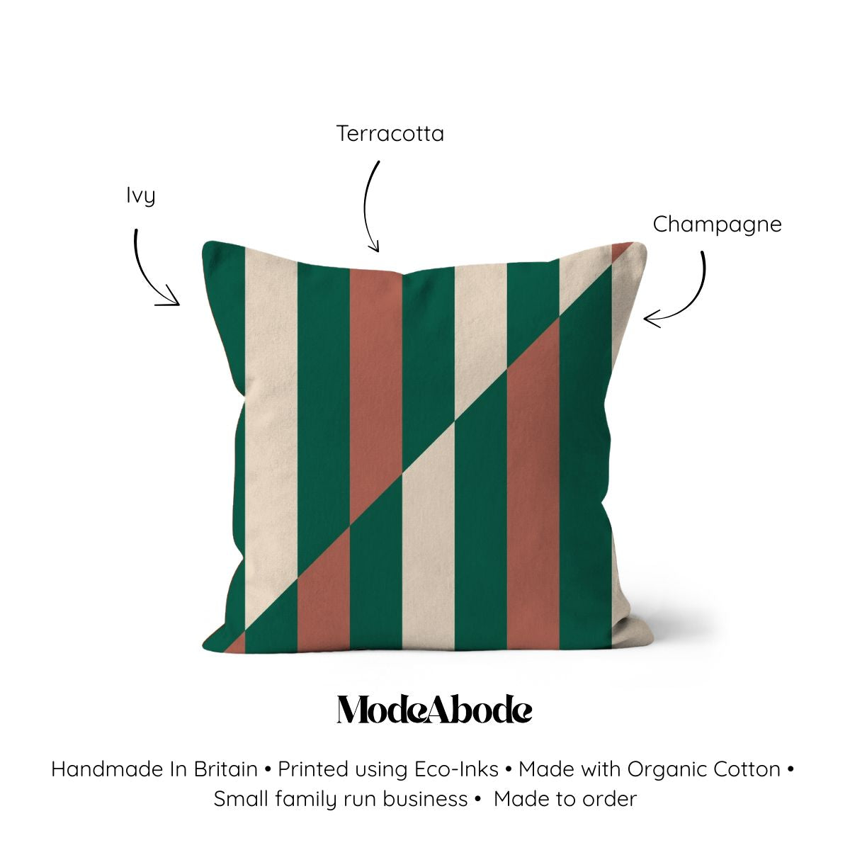 Add refined colour contrast to your interior with this green and terracotta striped cushion cover by Mode Abode. Designed in our Brighton studio and ethically made in the UK from 100% organic cotton, it features bold vertical stripes with a diagonal split, blending warm and earthy tones for a modern yet timeless look. Printed on both sides and finished with a concealed zip closure for a polished finish.